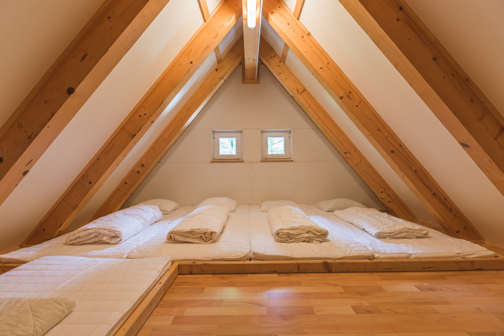 - Blau (Erdgeschoß: 1x 2-Bettzimmer, Obergeschoß: 1x 5-Bett-Matratzenlager, 1x 3-Bett-Matratzenlager)