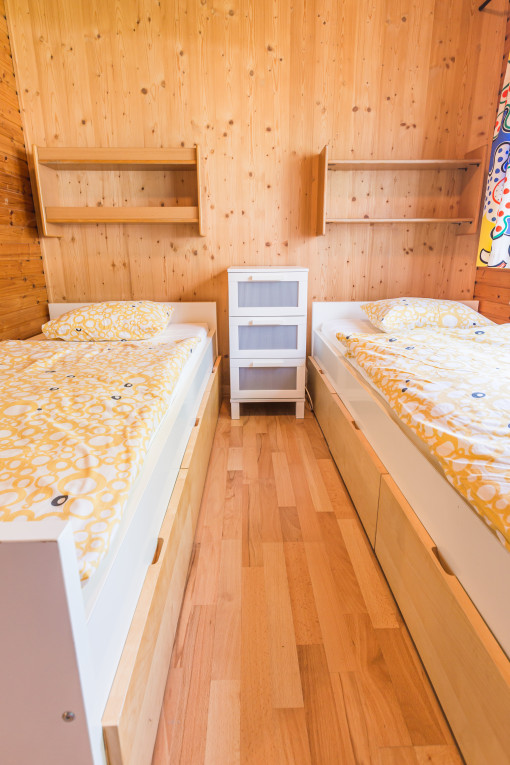 - Lila/Gelb/Grün (Erdgeschoß: 1x 5-Bett-Zimmer, Obergeschoß: 1x 3-Bettzimmer, 1x 5-Bett-Zimmer)